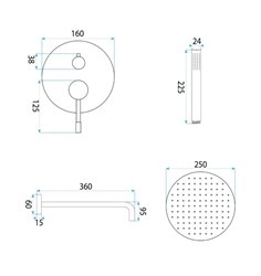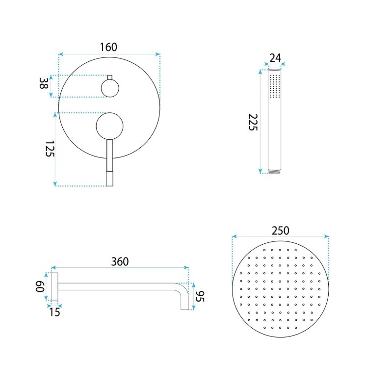 Pełny komplet – zawiera baterię, deszczownicę, ramię, wąż 1500 mm, słuchawkę, uchwyt na słuchawkę, maskownice i box montażowy.