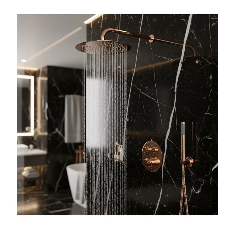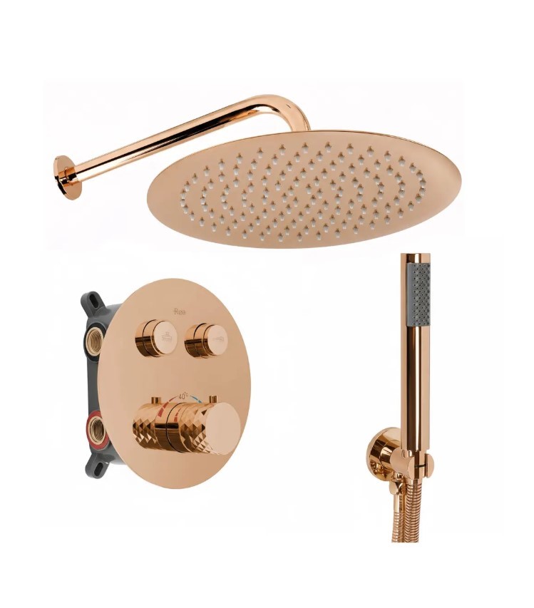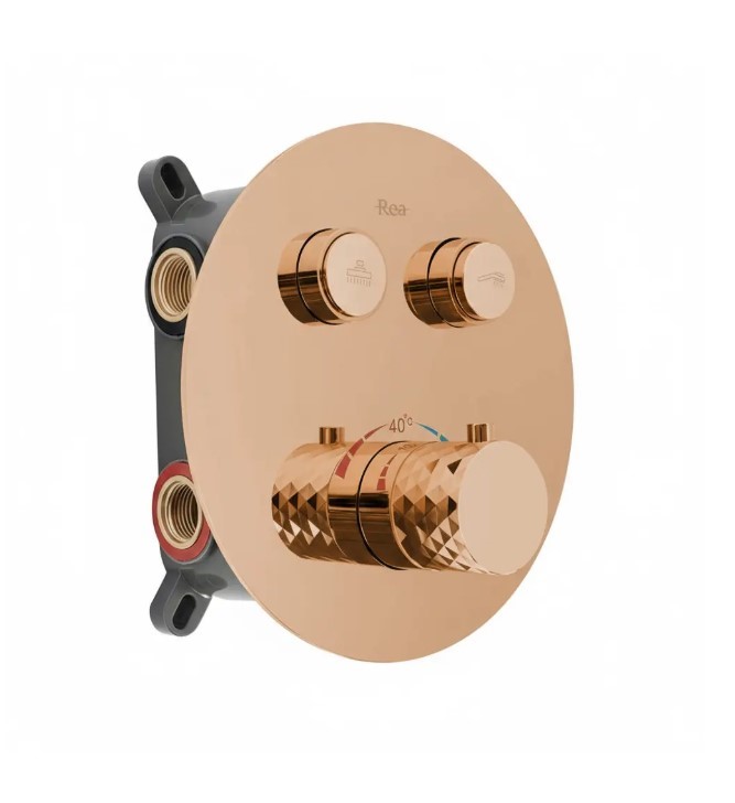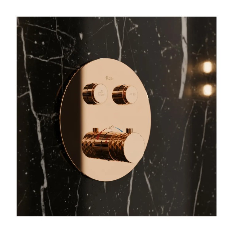 Zapewnij sobie luksus i precyzyjną kontrolę temperatury dzięki zestawowi prysznicowemu podtynkowemu Rea Lungo Diamond z baterią termostatyczną, w kolorze Miedź Połysk. Ten zestaw łączy niepowtarzalny design diamentowych zdobień z nowoczesną technologią. Wykonany z solidnych materiałów, w tym metalowa deszczownica i korpus pokryty trwałą powłoką PVD, zapewnia niezawodność i wyjątkowy wygląd w każdej łazience.Bateria termostatyczna – gwarantuje stałą, komfortową temperaturę wody (z blokadą 40°C), chroniąc przed nagłymi skokami temperatury.