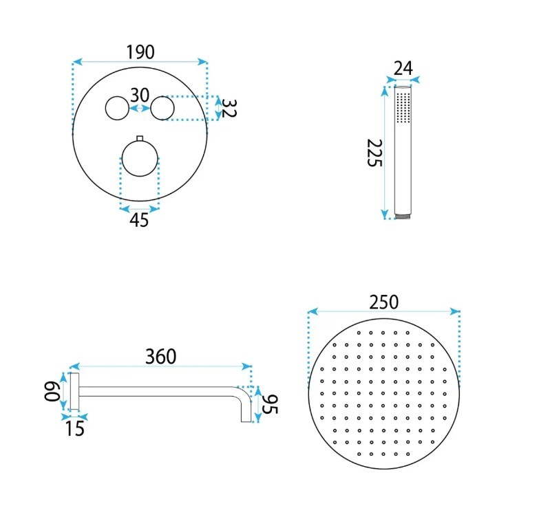 Kompletny zestaw – zawiera baterię termostatyczną z boxem, deszczownicę, ramię, słuchawkę prysznicową, wąż i uchwyt punktowy.