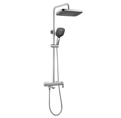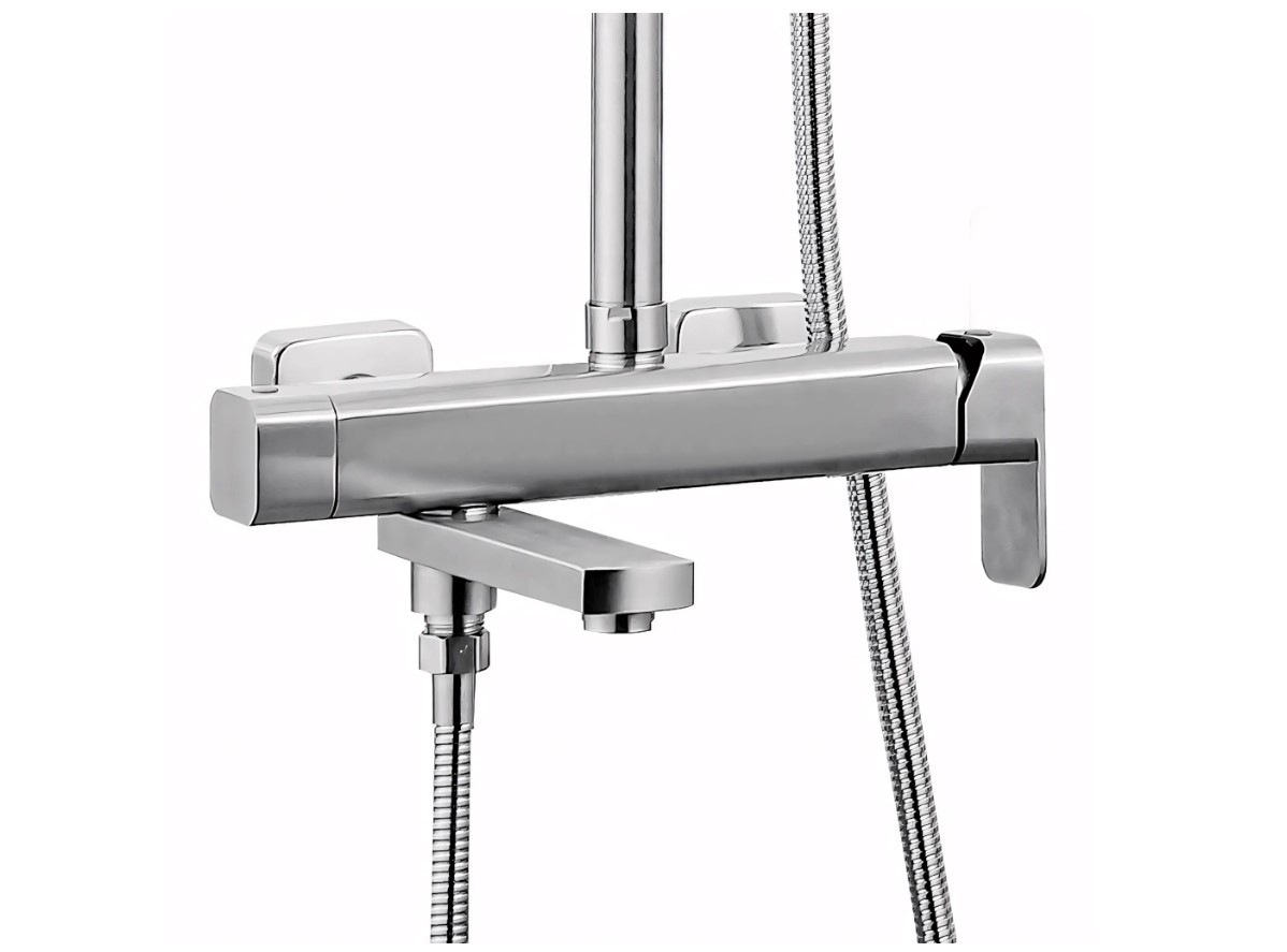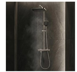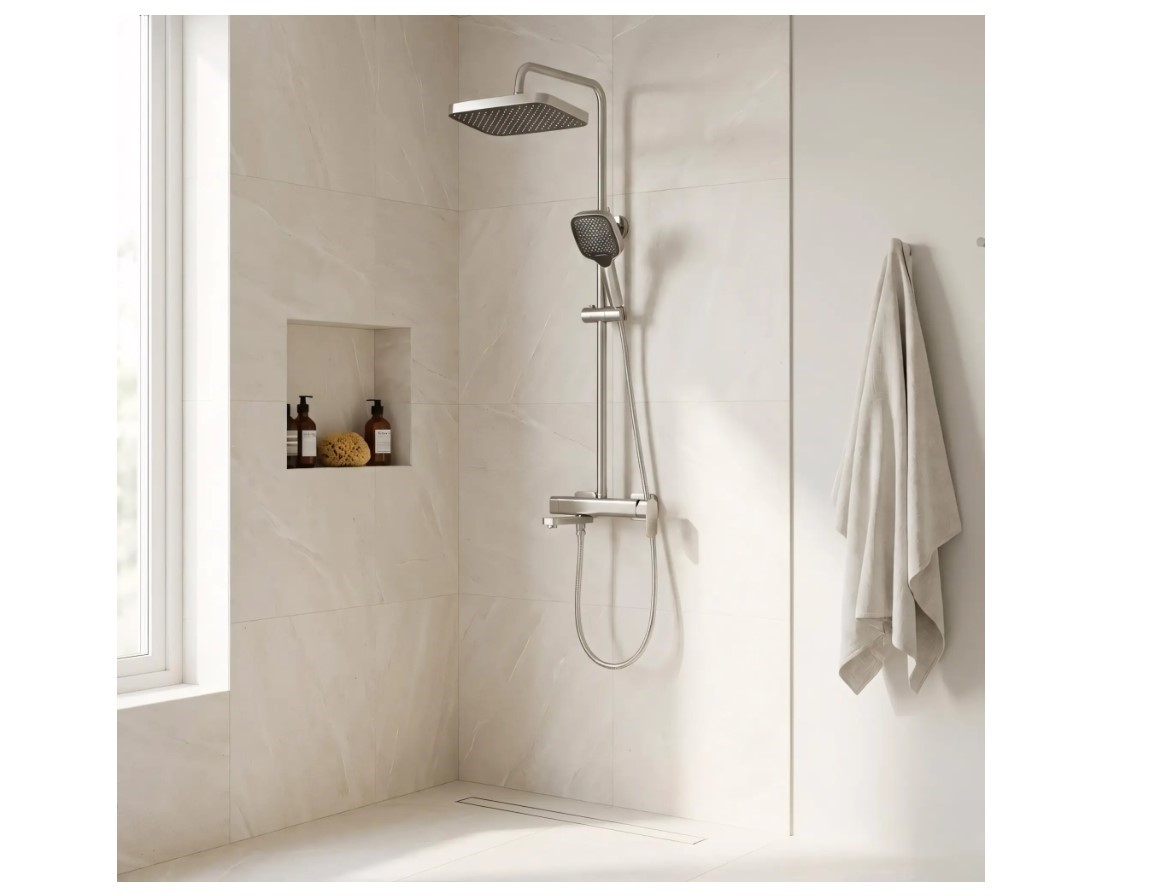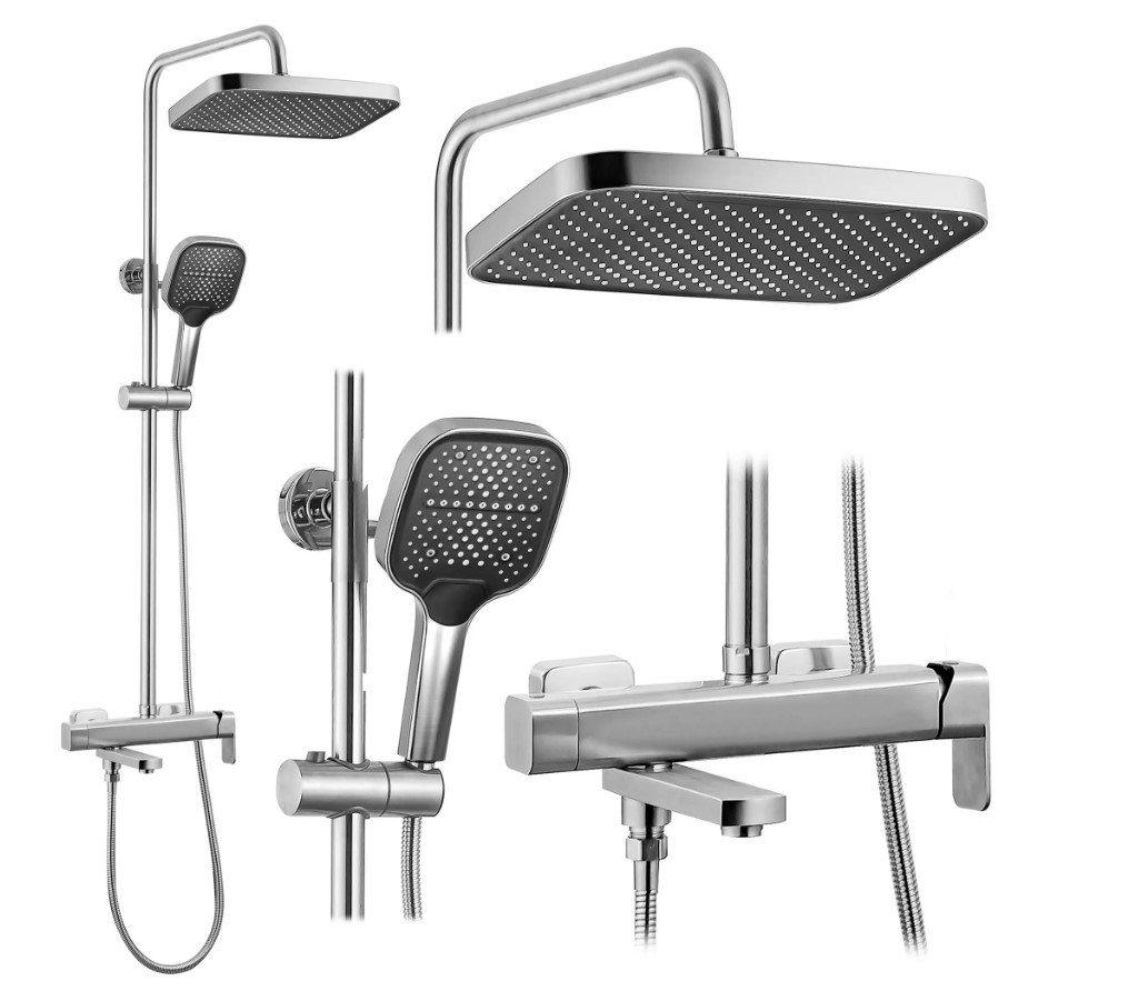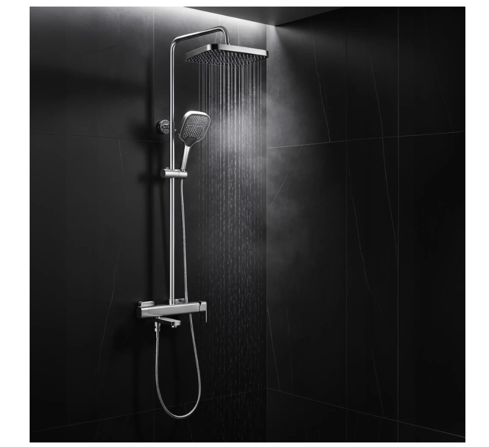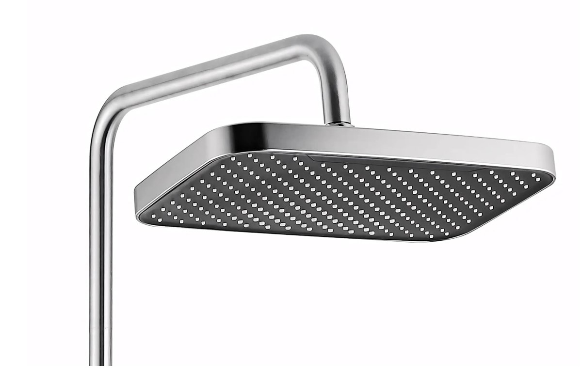 Geometryczny design – kwadratowe formy deszczownicy i słuchawki idealnie wpisują się w estetykę nowoczesnych i industrialnych łazienek.